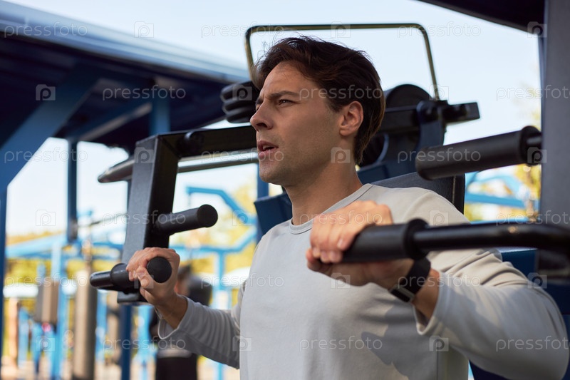 Молодой человек занимается на фитнес-машине во время тренировки