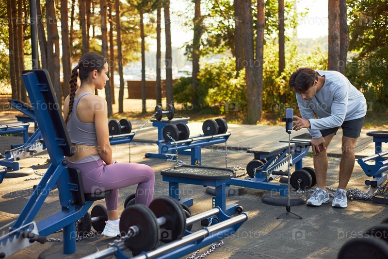 Молодая женщина сидит, пока молодой человек регулирует смартфон на открытом воздухе