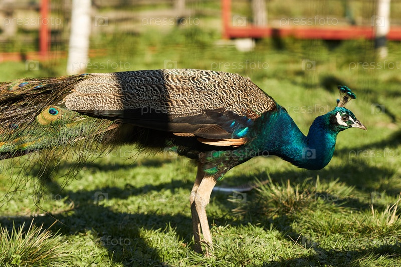Индийский павлин ходит по траве на солнце в заповеднике для животных