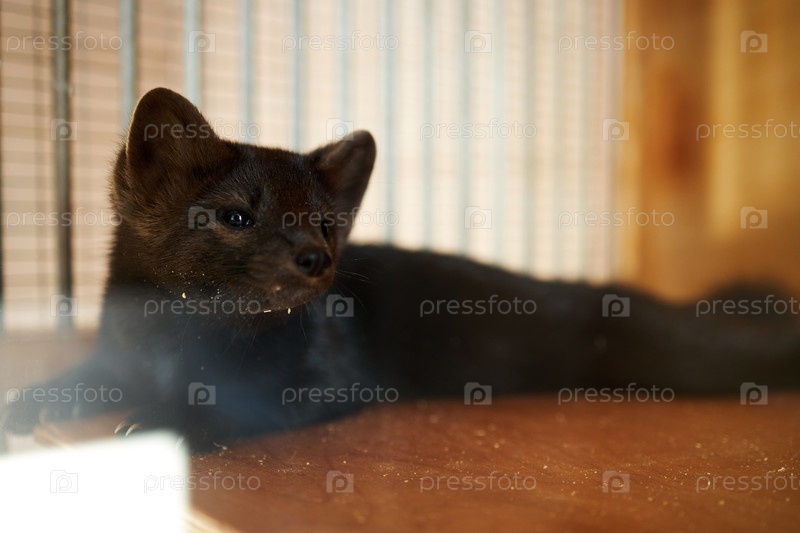 Молодой черный сабель отдыхает в помещении в неволе, оглядываясь на сторону