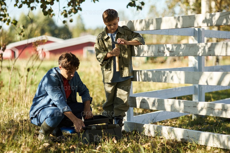 Мужчина и мальчик ремонтируют деревянный забор вместе на открытом воздухе на ферме