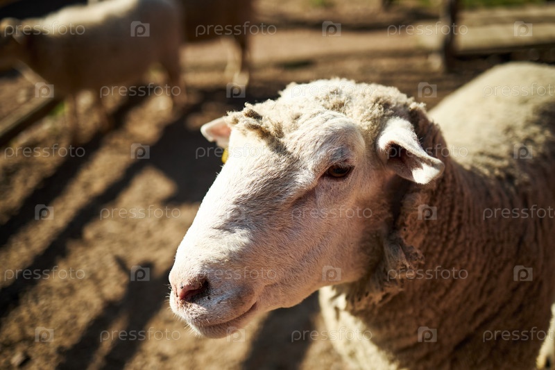 Овцы стоят на свежем воздухе в солнечный день на ферме и смотрят на камеру