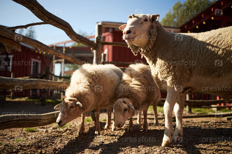 Взрослая овца стоит рядом с двумя молодыми овечками, пасущимися на открытом ферме