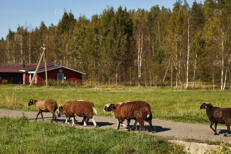 Стадо коричневых овец ходят вдоль сельской дороги возле леса в солнечный день
