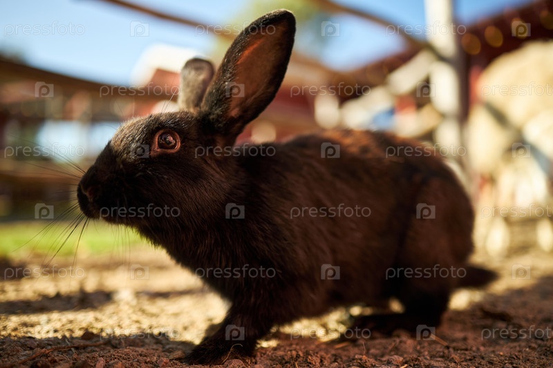 Черный кролик исследует наружную ферму во время солнечного дня в ближайшем просмотре