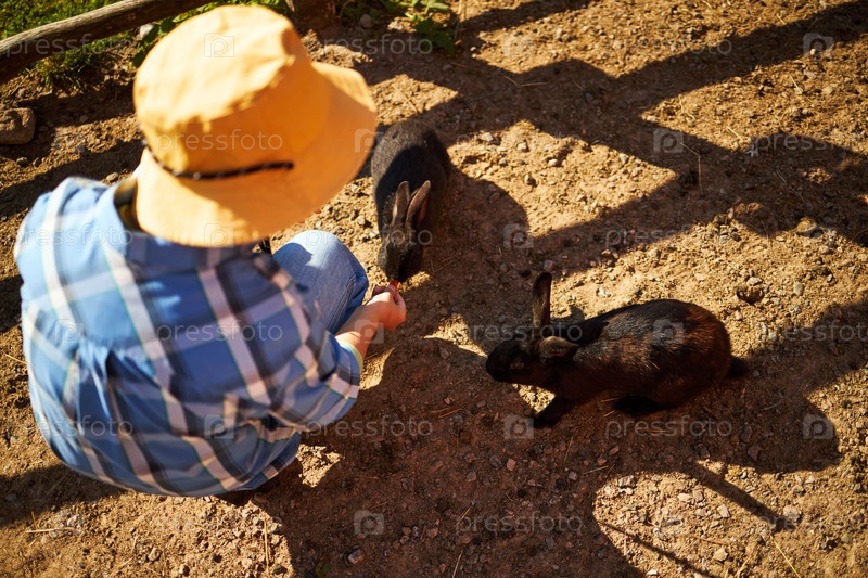 Молодая взрослая женщина кормит черных кроликов на свежем воздухе в солнечный день