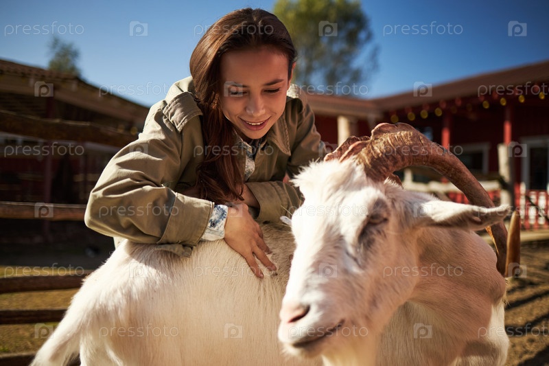 Молодая женщина улыбается, пока ласкает козу на ферме