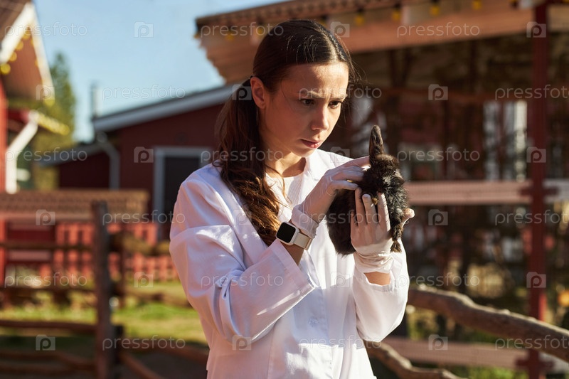Молодая взрослая женщина изучает мелких животных на открытом воздухе на ферме