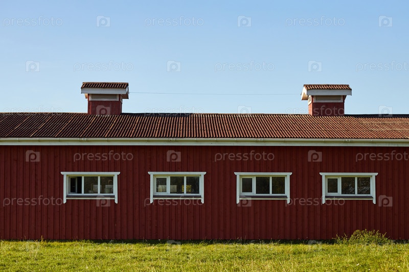 Красный деревянный сарай стоит в солнечном сельском ландшафте под чистым голубым небом
