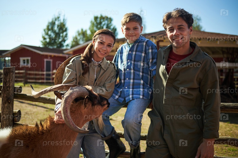 Семья улыбается вместе на открытом воздухе с козой на ферме в дневное время