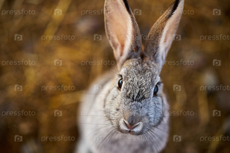 Портрет серого кролика, глядящего на камеру На природном фоне
