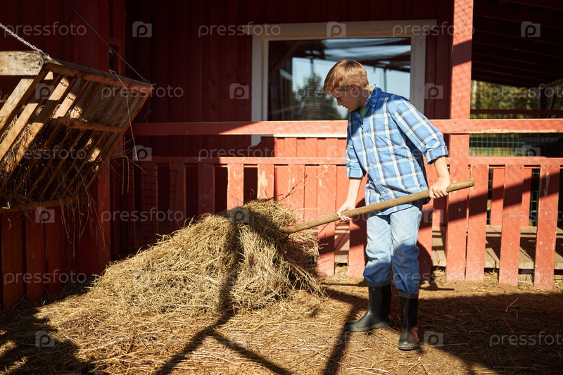 Мальчик лопает сена внутри амбара во время солнечного дня на ферме