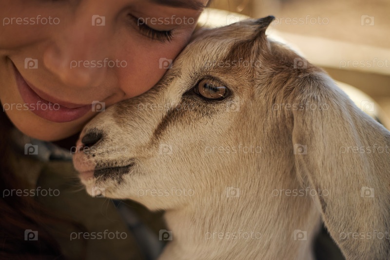 Молодая женщина улыбается, обнимая козьего малыша на открытом воздухе