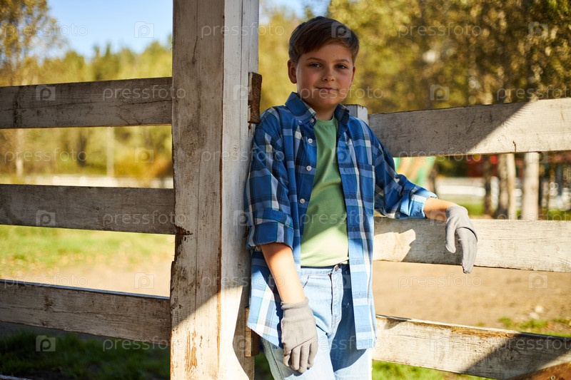 Мальчик, опирающийся на деревянный забор улыбается на улице в солнечный день