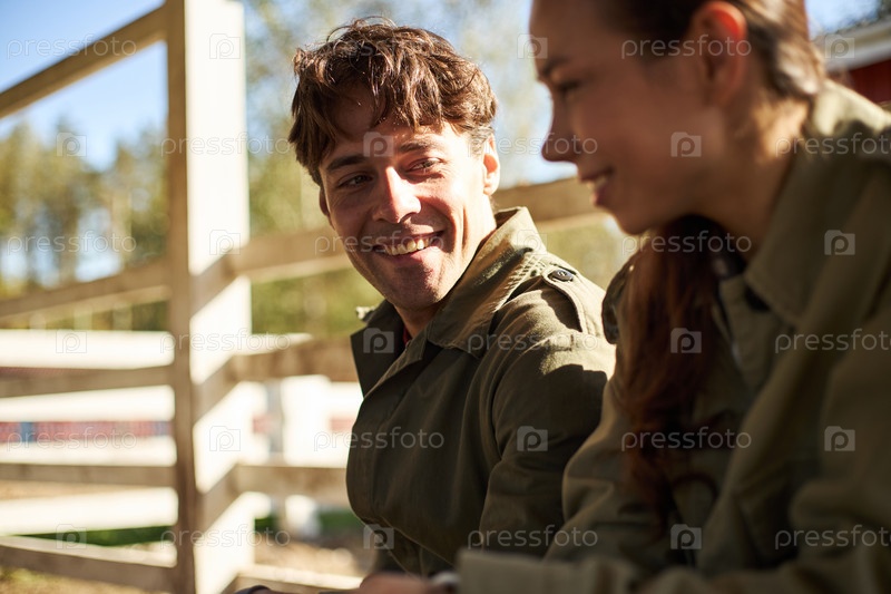 Молодой человек улыбается, разговаривая с молодой женщиной на открытом воздухе