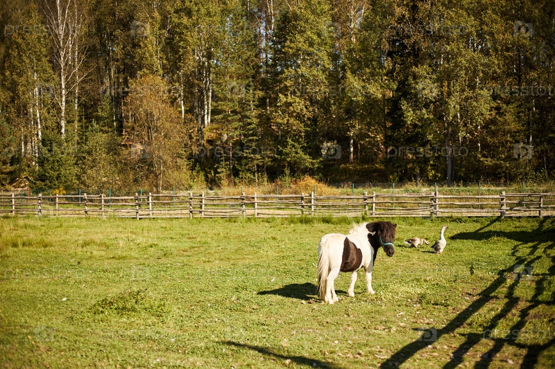 Миниатюрный пони стоит на травяном пастбище возле гусей в солнечной деревне