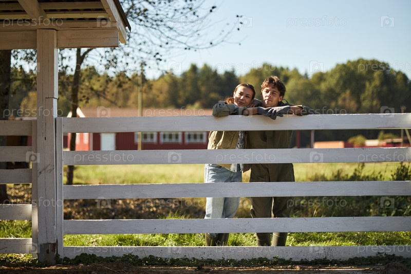 Молодая женщина и молодой человек, опирающиеся на забор на открытом воздухе