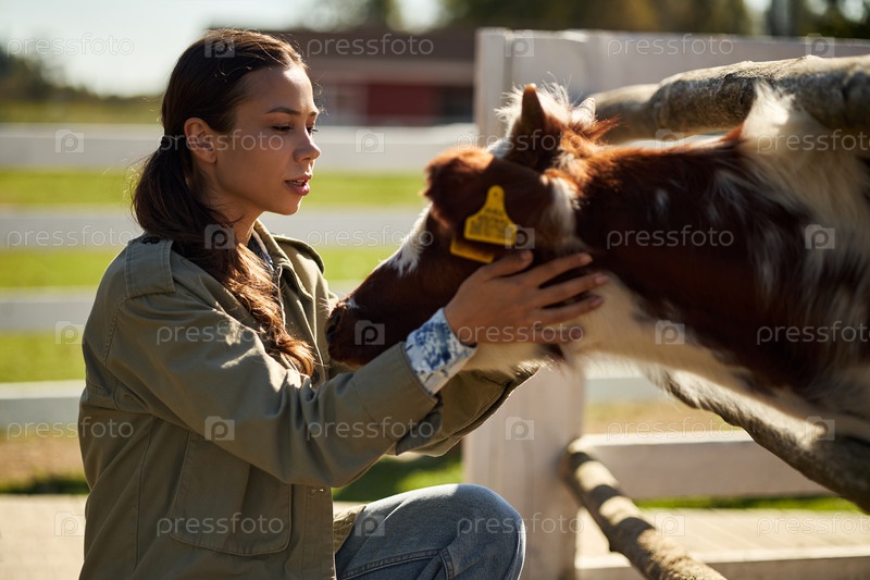 Молодая взрослая женщина мягко ласкает теленка на ферме в дневное время