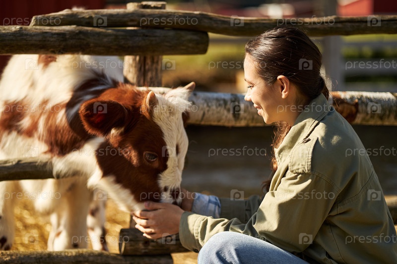 Молодая взрослая женщина кормит телёнка на улице в солнечном ферме утром