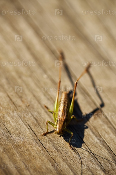 Ближайшее изображение саранчи, отдыхающей на деревянной поверхности под естественным солнечным светом
