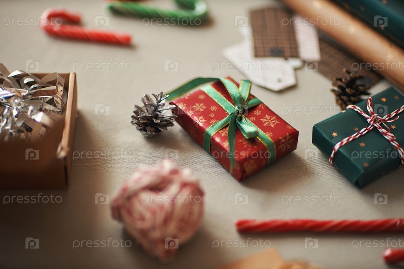 Рождественские подарки и конфеты расположены на столе, чтобы отпраздновать праздничный сезон