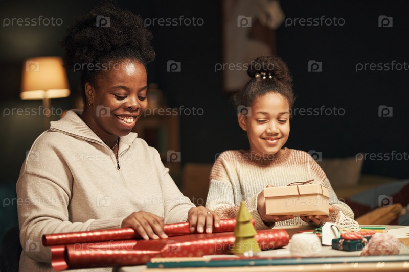 Улыбающаяся чернокожая женщина и молодая чёрная девушка вместе упаковывают рождественские подарки