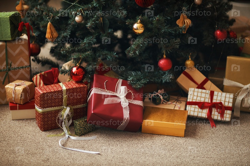 Рождественские подарки расположены под деревом в ожидании празднования и семейного сбора
