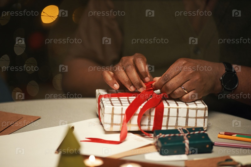 Чёрный мужчина средних лет упаковывает коробку для рождественских подарков с красной лентой в помещении