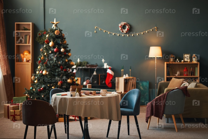 Выставлена современная гостиная с рождественской елкой и праздничными украшениями