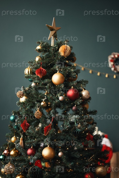 Декорированная рождественская елка с праздничными украшениями и золотой звездой