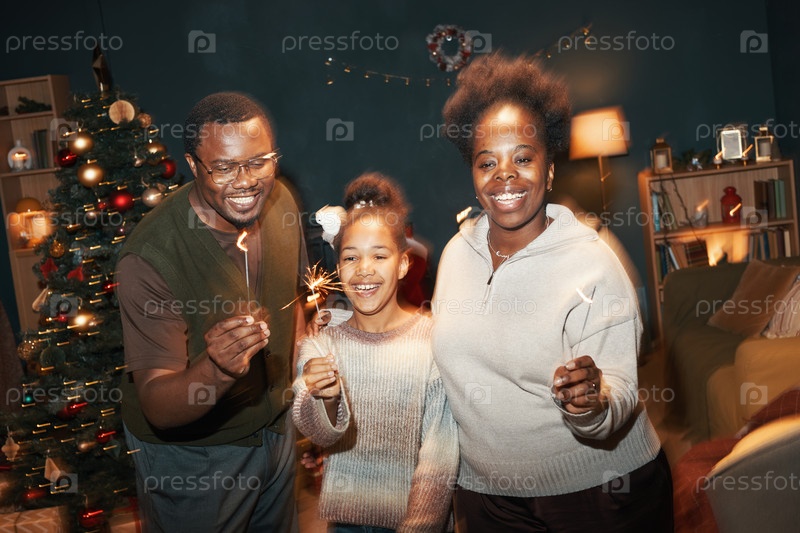 Портрет чёрной семьи, празднующей Рождество, держащей в руках искри внутри