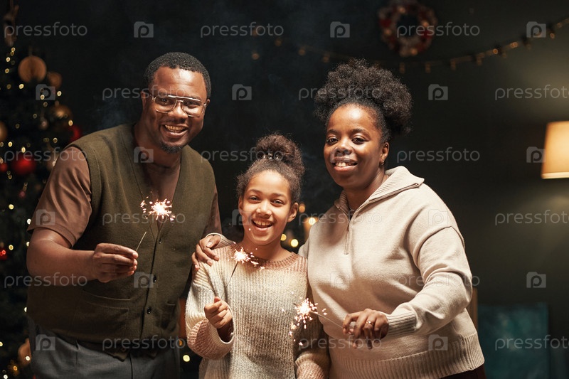 Портрет счастливой чернокожей семьи, празднующей Рождество, держащей в руках искри внутри