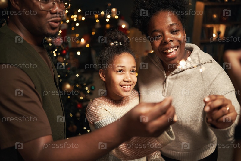 Черная семья празднует Рождество вместе, держа в руках искри внутри дома