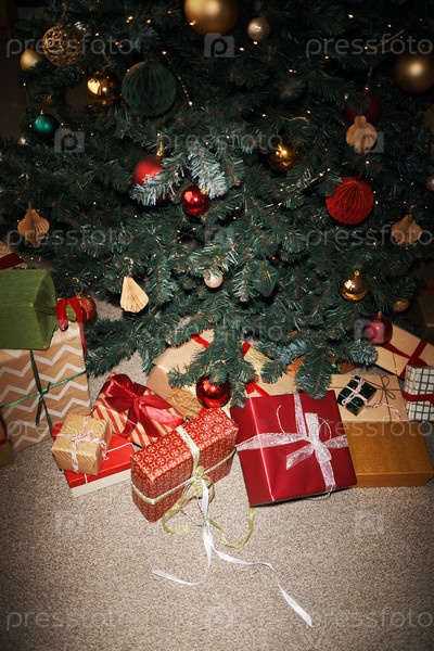 Рождественская елка, демонстрирующая упакованные подарки и украшения во время праздничного торжества