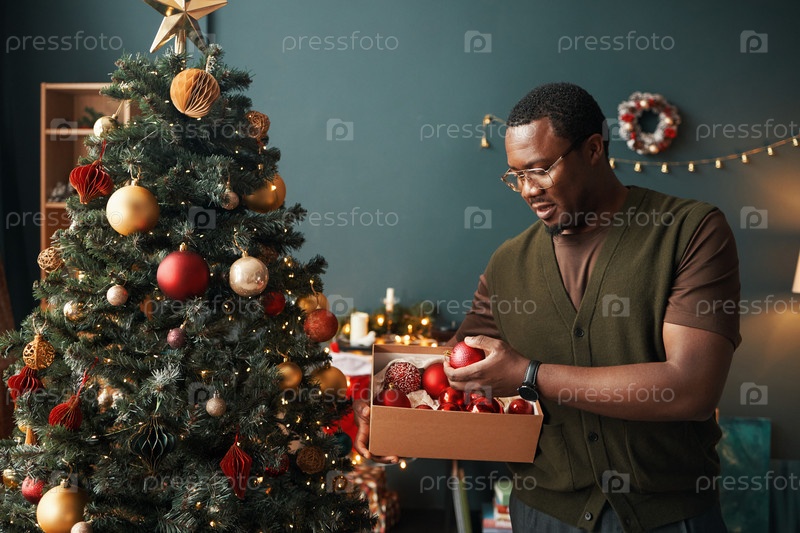 Чернокожий мужчина средних лет украшает рождественскую елку орнаментами в помещении