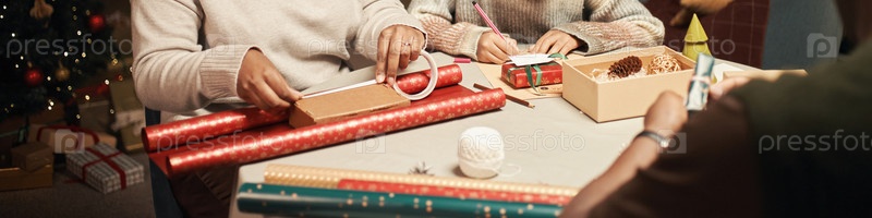 Женщина и подросток вместе за столом упаковывают рождественские подарки