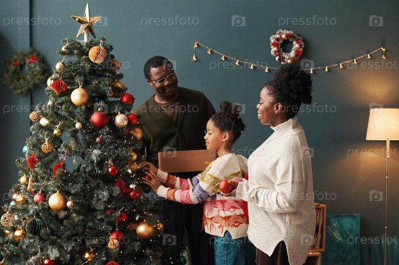 Черная семья украшает рождественскую елку вместе в праздничной гостиной
