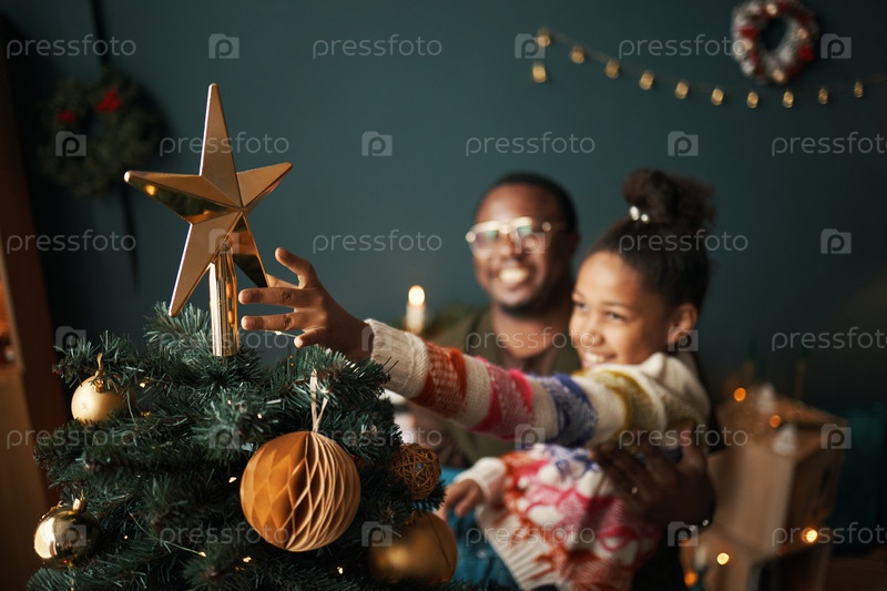 Улыбающийся чернокожий мужчина помогает молодой девушке украсить рождественскую елку вместе