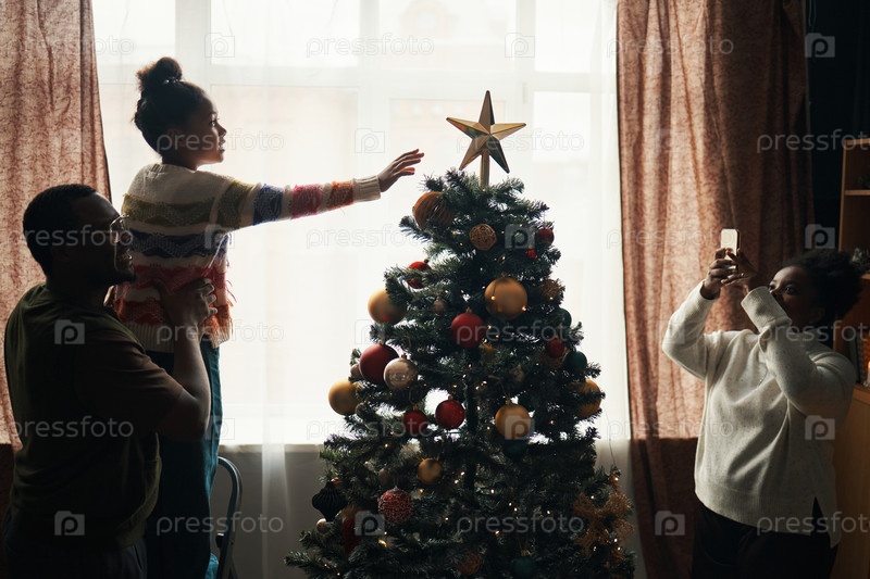 Девушка украшает рождественскую елку с членами семьи, которые смотрят и улыбаются