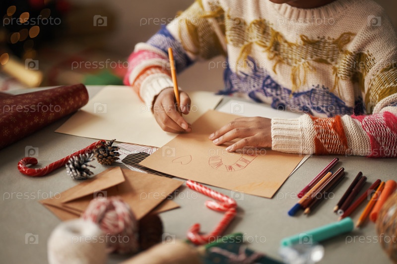Дети рисуют рождественские открытки в окружении праздничных украшений и батончиков