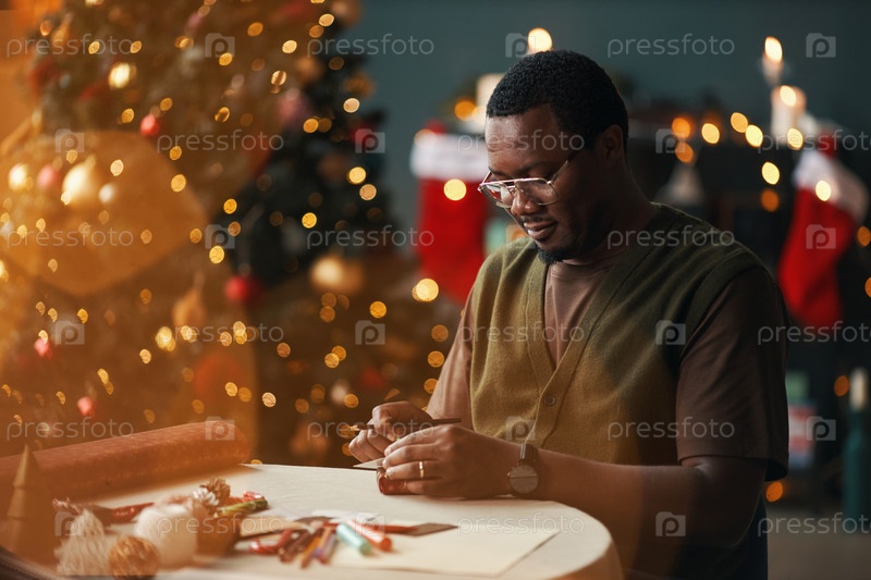 Чернокожий мужчина средних лет упаковывает рождественские подарки возле украшенной елки