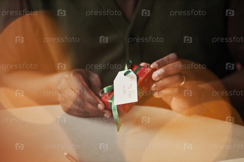 Чернокожий мужчина среднего возраста завертывает рождественский подарок с персонализированным тегом