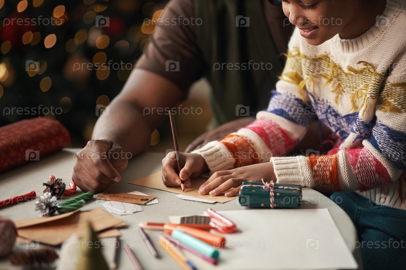 Молодая черная девушка пишет рождественские открытки со взрослым мужчиной, помогающим за столом