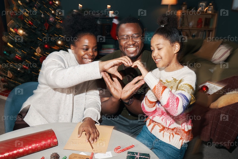 Семья улыбается, делая руки в форме сердца вместе во время Черного Рождества
