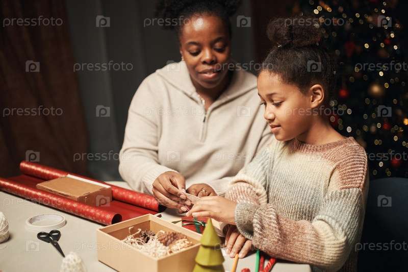 Черная женщина помогает молодой девушке упаковывать рождественские подарки за праздничным столом
