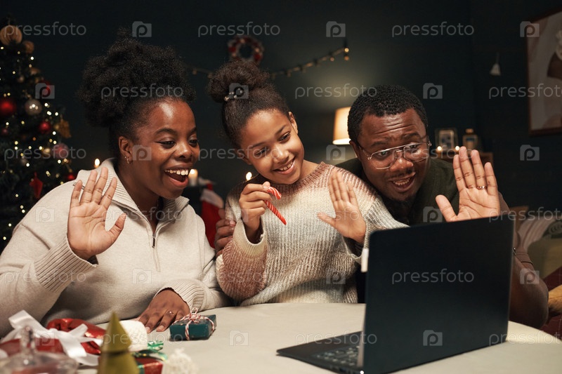 Черная семья размахивает во время рождественского видеозвонка с ноутбуком Happy Indoors