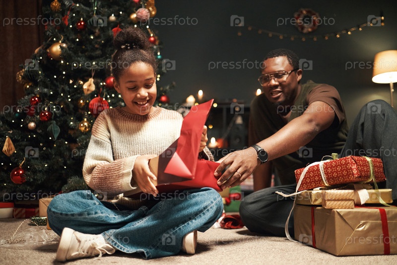 Улыбающаяся черная девушка открывает рождественский подарок с темнокожим мужчиной среднего возраста, который смотрит