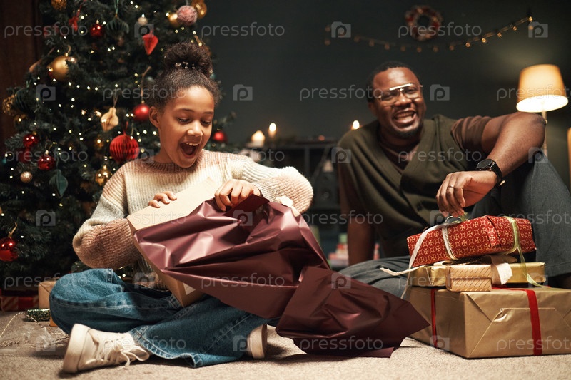 Взволнованная чернокожая девушка открывает коробку для рождественских подарков с улыбающимся чёрным мужчиной, который смотрит