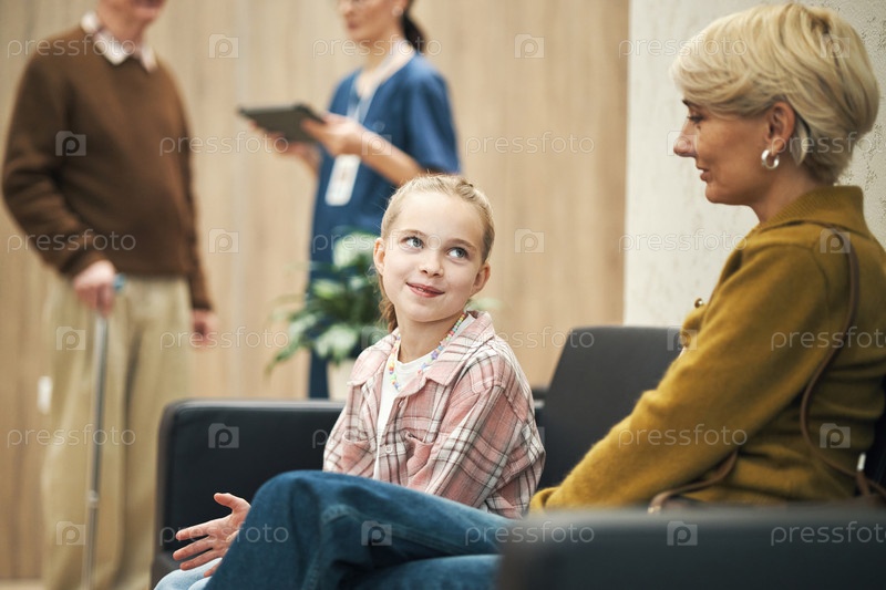 Девочка улыбается матери, ожидая встречи с врачом