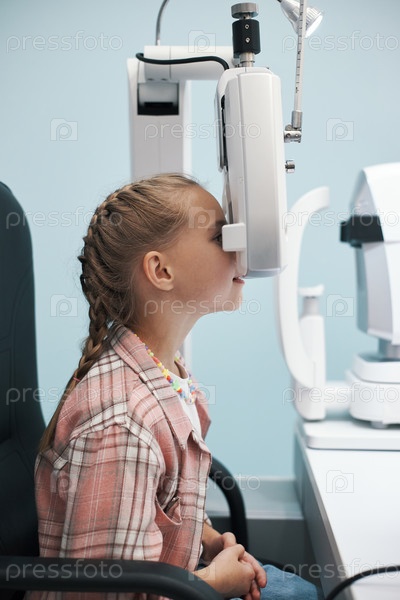 Девочка, проходящая обследование глаз с использованием офтальмологического оборудования